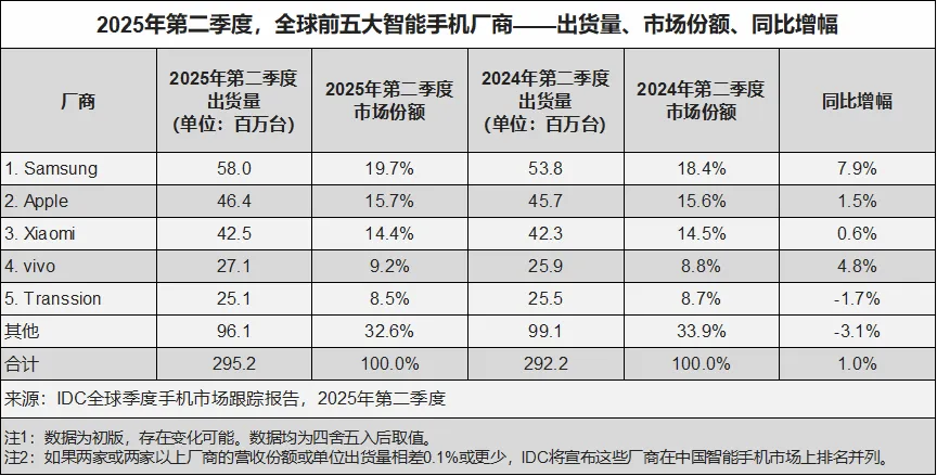 基于IDC公布的2025年第二季度全球智能手机市场出货份额信息,vivo海外市场份额提升明显,全球市场份额同比增幅4.8%,以9.2%的全球市场份额位列第四,成为全球智能手机市场出货量同比增幅最大的中国手机品牌。
