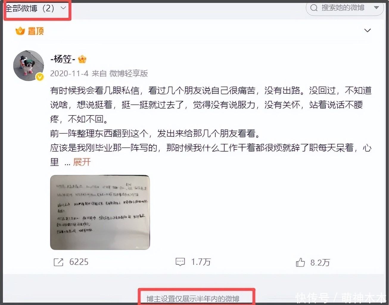 打开杨笠的微博,会发现她设置了半年可见,置顶内容是2020年发布的一篇感想文,提到自己在求职期间遭遇的难关和痛苦,但一切都终将向好,挺一挺就过去。2020年正是杨笠因为“普信男”名句走红的一年,完全表达了她的心境变化。注意看的话,会发现提示框显示全部微博条数为“2”,说明她删除了大部分微博,只保留了2条。